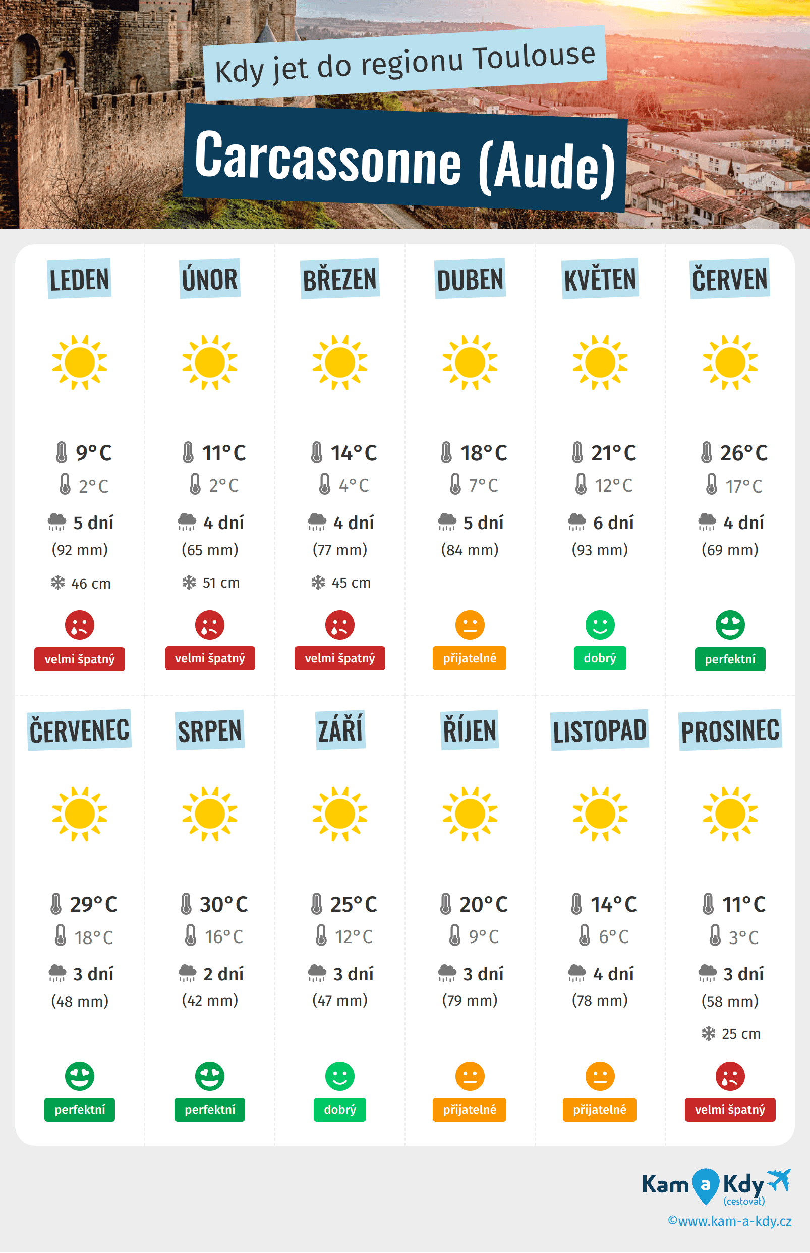 Takže, kdy je nejlepší čas pro cestu do Carcassonne (Aude)? Zde je několik dalších informací, které vám pomohou při rozhodování: