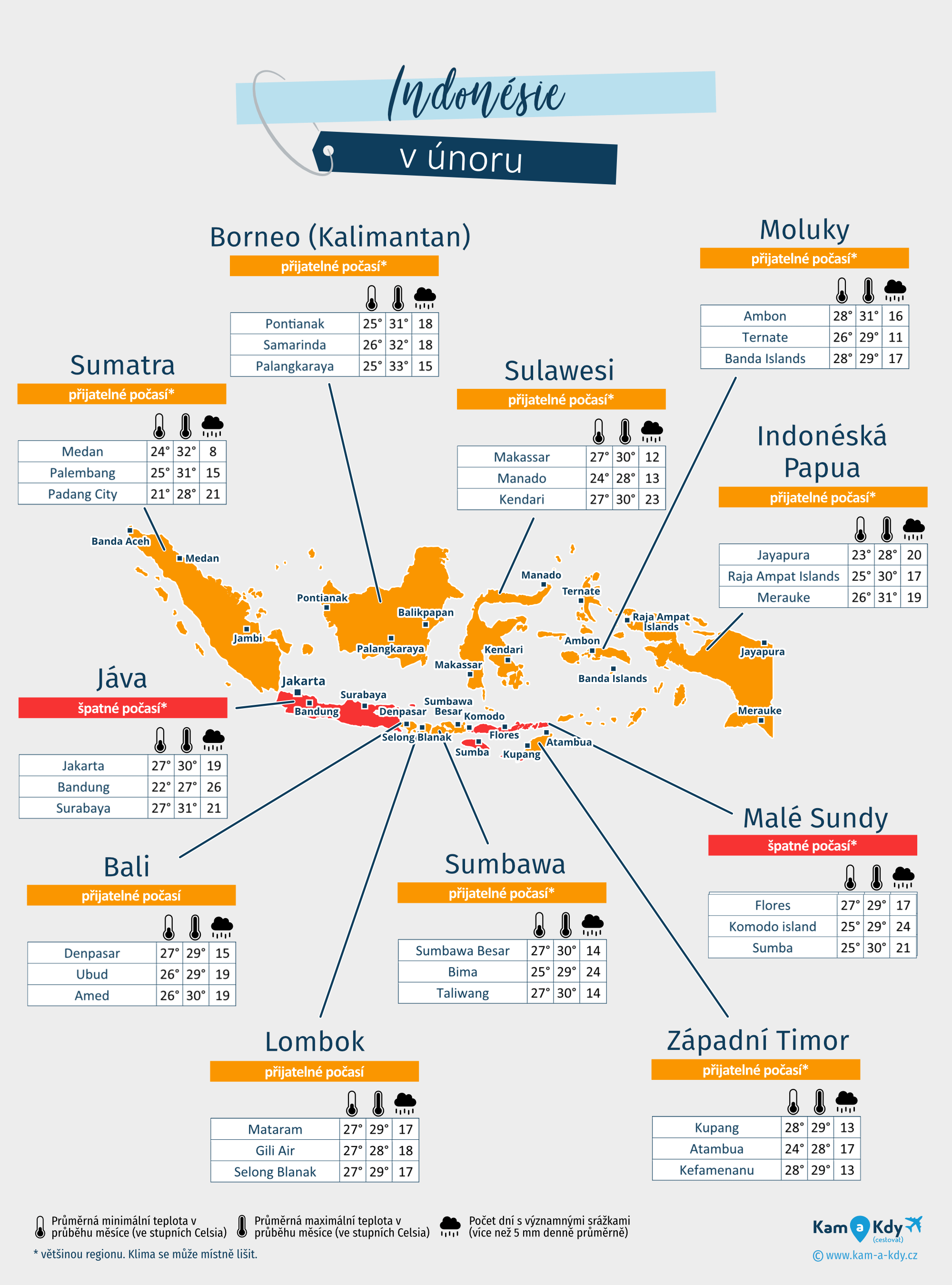 Klima v Indonésii v únoru je přijatelné až velmi špatný v závislosti na oblasti a městu.