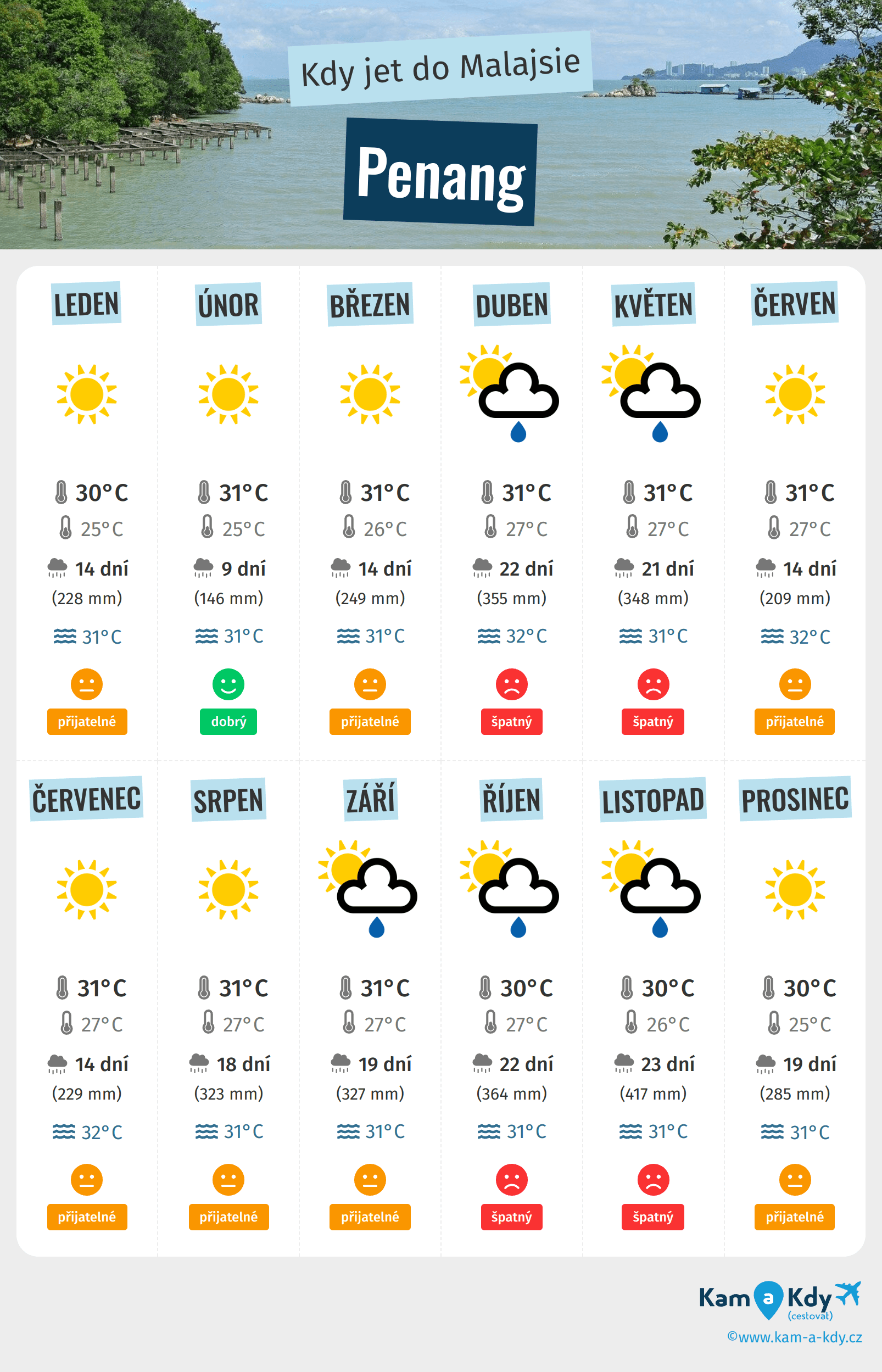 - Nejlepší měsíc pro dobré počasí v Penang je únor