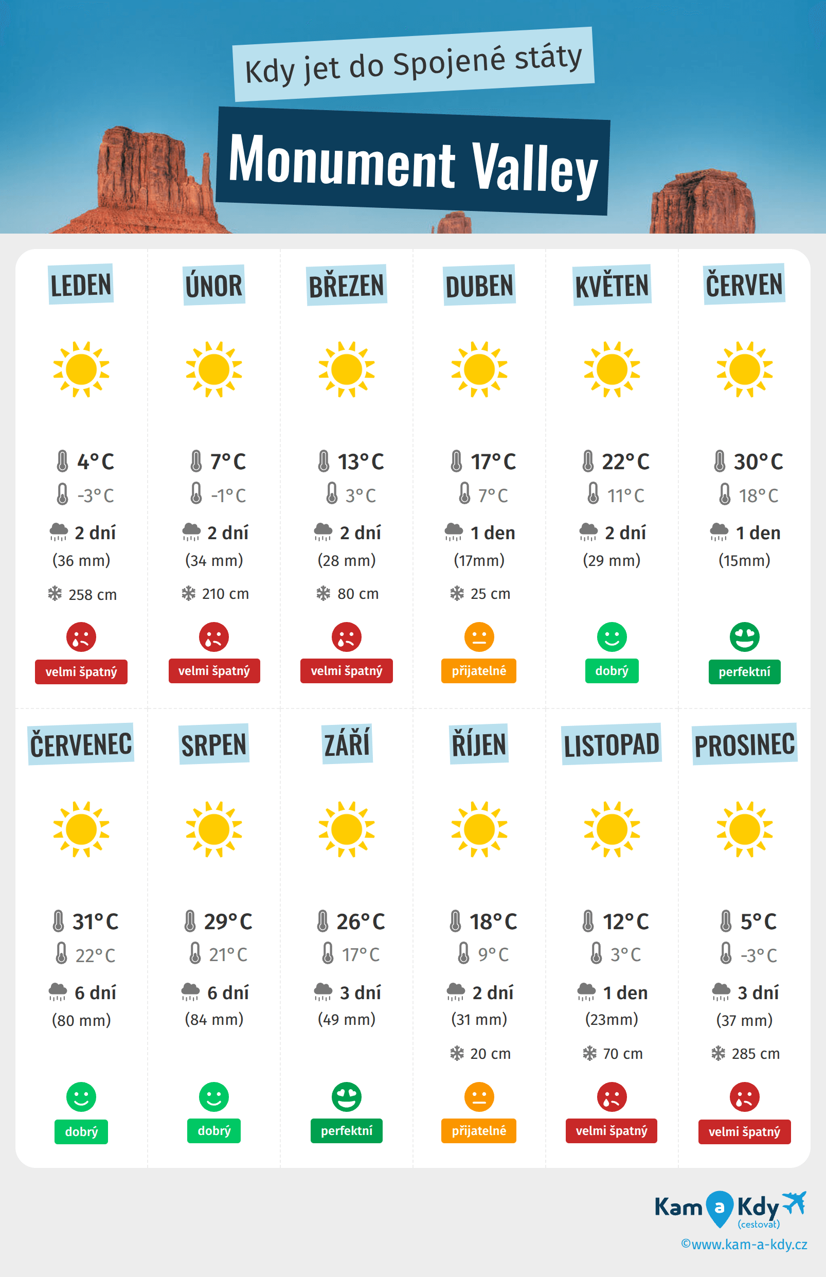- Nejlepší měsíce pro dobré počasí v Monument Valley jsou Květen, červen, červenec, Srpen a Září