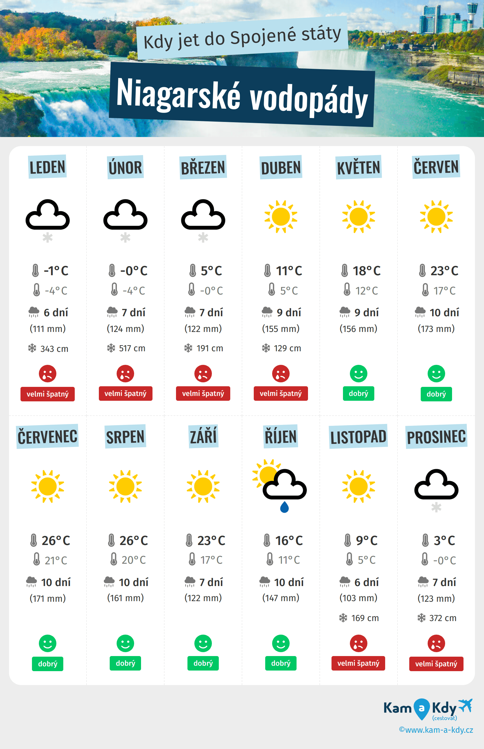 - Nejlepší měsíce pro dobré počasí na Niagarských vodopádů jsou Květen, červen, červenec, Srpen, Září a říjen