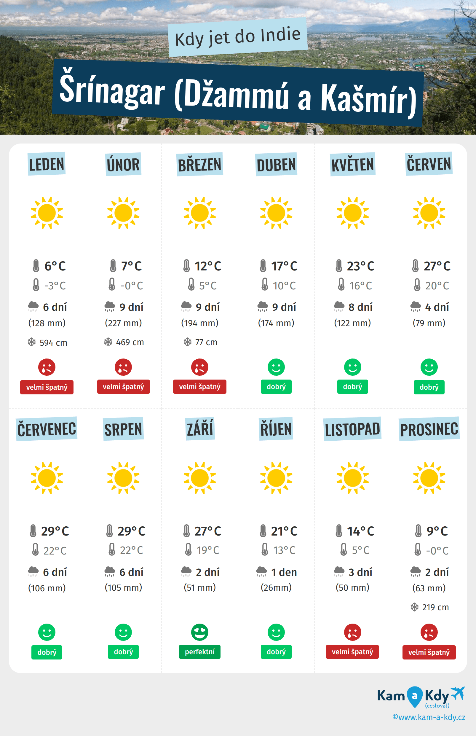 - Nejlepší měsíce pro dobré počasí v Šrínagaru (Džammú a Kašmír) jsou Duben, Květen, červen, červenec, Srpen, Září a říjen
